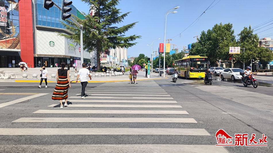 上午9时许,记者在百货大楼十字路口看到,交警和戴着小红帽、红袖章的交通劝导员一边指挥行人过斑马线,一边阻止非机动车抢道,劝导车辆礼让行人。