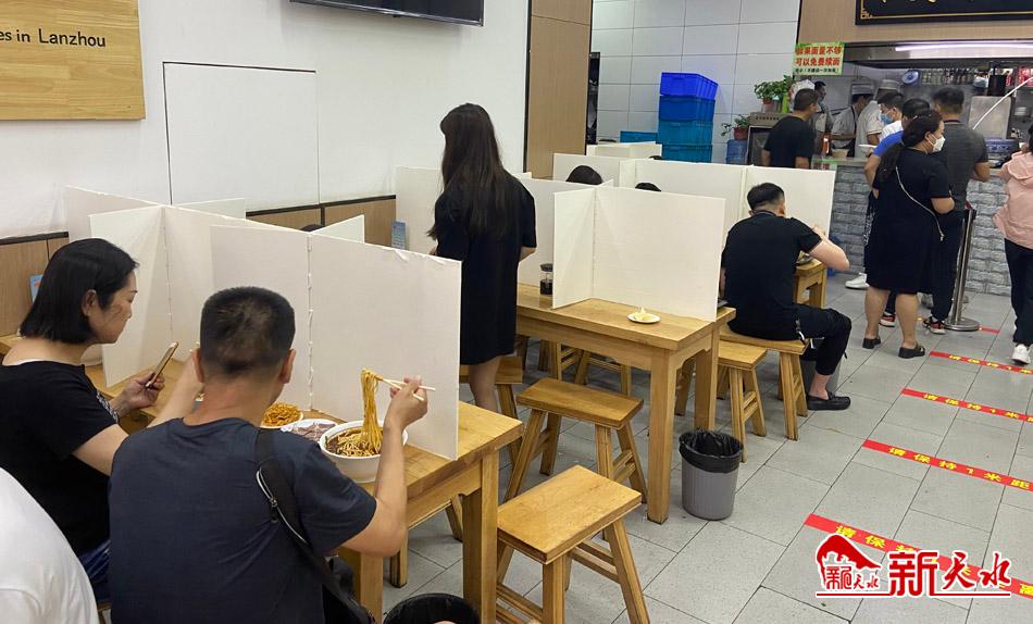 “老板,两碗面、两份肉、一个小菜。”“打包带走。”……8月1日中午时分,麦积区天河南路一家牛肉面馆的顾客接踵而至,店员在氤氲着热气的后厨井然有序地忙碌着,前台不断有顾客来点餐。记者看到,进店顾客都会自觉排队扫码,保持距离有序取餐。
