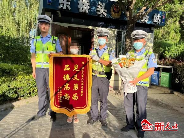 新天水讯【记者蔚军平】7月29日,薄女士来到秦州公安分局城区交警大队三中队东桥头警务站,将一面写有“见义勇为、品德高尚”的锦旗送到了三中队杨高伟手中,对他及其同事深夜及时救助事故中的伤者表示感谢。