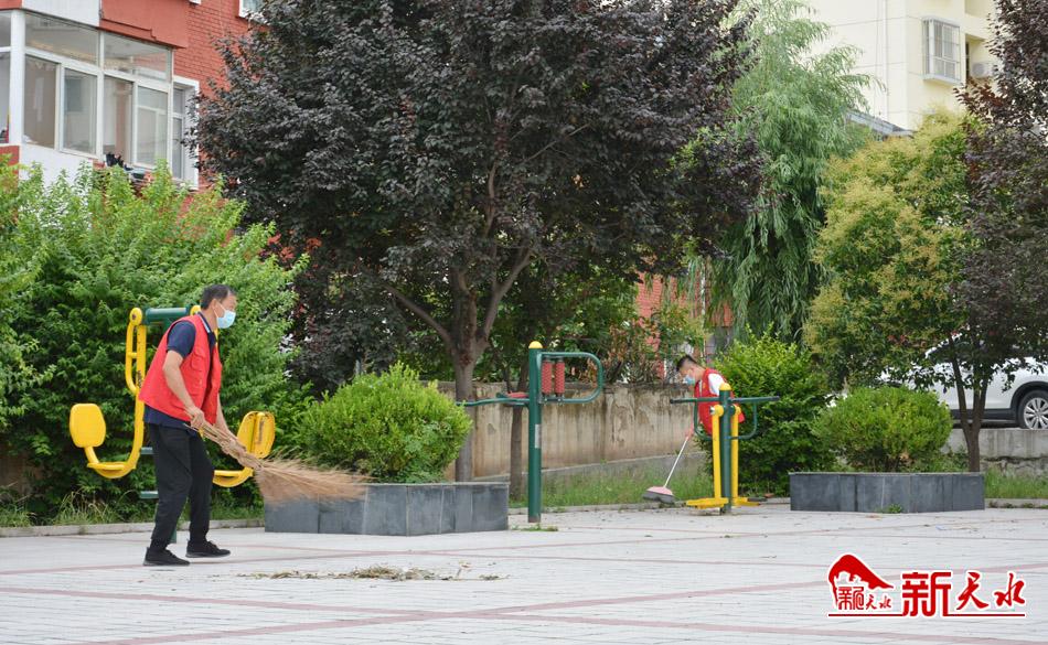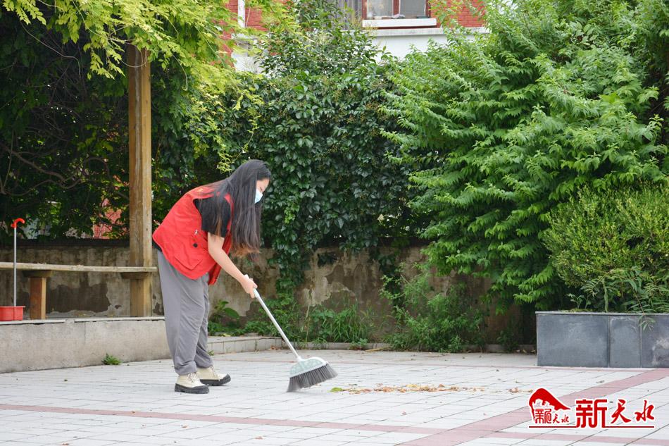 近日,记者在玉泉镇七里墩天河新村看到,戴有小红帽、穿着红马甲的志愿者们携带扫帚、笤帚、簸箕等清扫工具正在清扫巷道、长廊以及广场区域的垃圾、落叶中。