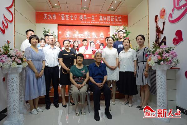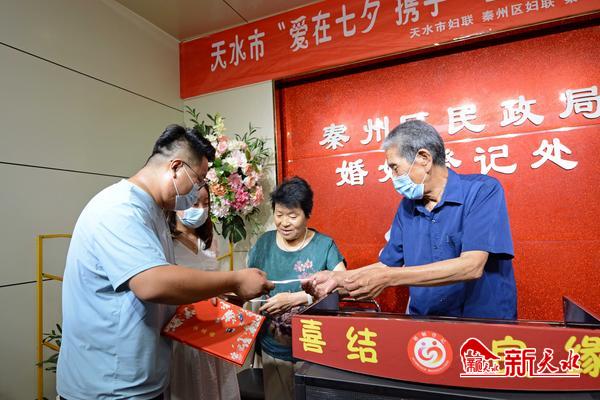 今年8月4日是中国传统节日“七夕”。当天,情侣们来到秦州区民政局婚姻登记处登记结婚、办理结婚证。天水市妇联、秦州区妇联、秦州区民政局现场举行了“爱在七夕,携手一生”集体颁证仪式,为其中6对新人颁发了结婚证。并邀请了婚龄62年的李自强、黄秀英夫妇为新人颁证。新天水记者 孙镇 摄