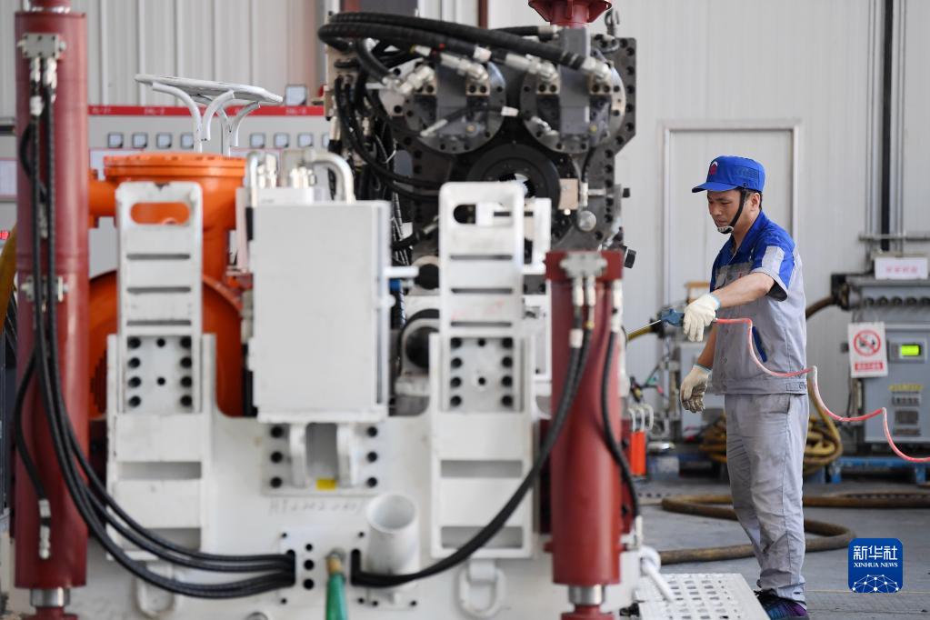 2022年6月17日,在秦创原总窗口所在地陕西省西咸新区的陕西太合智能钻探有限公司,工人准备对智能定向钻机进行性能调试。新华社记者 李一博 摄
