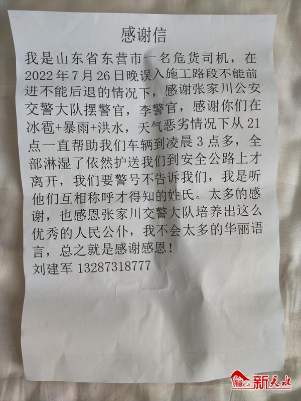 提起当天的情况,司机写信感谢道:”感谢你们在冰雹+暴雨+洪水,天气恶劣情况下对我的救助。”原来,7月26日晚8时左右,大队城区中队民辅警在公园路口执勤执法巡逻过程中接到群众救助,发现一名危化品大货车司机误入省道施工路段导致路面拥堵,为了防止司机朋友在不熟悉路况而导致受困事件的发生,张家川公安交警第一时间在拥堵路段设置醒目标识,并引导司机走G566国道,嘱咐司机驾驶路线,提醒大暴雨可能引发山体滑坡,请小心谨慎驾驶,前往天水等地绕行高速方向行驶。