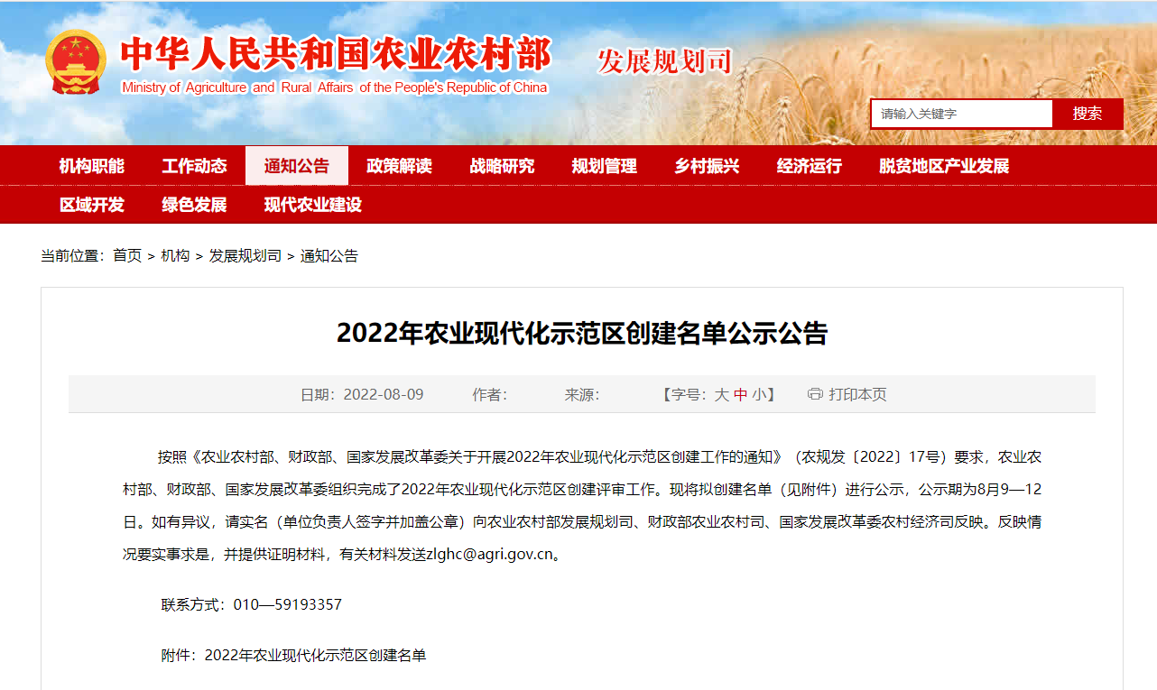 按照《农业农村部、财政部、国家发展改革委关于开展2022年农业现代化示范区创建工作的通知》(农规发〔2022〕17号)要求,农业农村部、财政部、国家发展改革委组织完成了2022年农业现代化示范区创建评审工作。现将拟创建名单(见附件)进行公示,公示期为8月9—12日。如有异议,请实名(单位负责人签字并加盖公章)向农业农村部发展规划司、财政部农业农村司、国家发展改革委农村经济司反映。反映情况要实事求是,并提供证明材料,有关材料发送zlghc@agri.gov.cn。