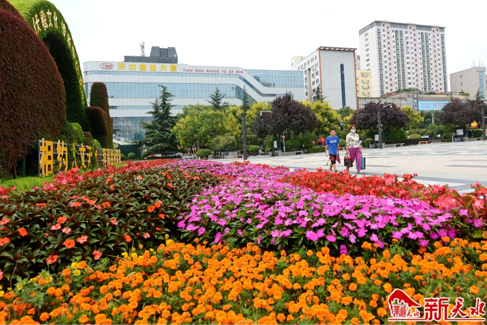 8月11日,秦州区园林部门组织人员在龙城广场更换景观花卉,市民行走在花团锦簇的龙城广场,感受着持续美化的城市风貌。