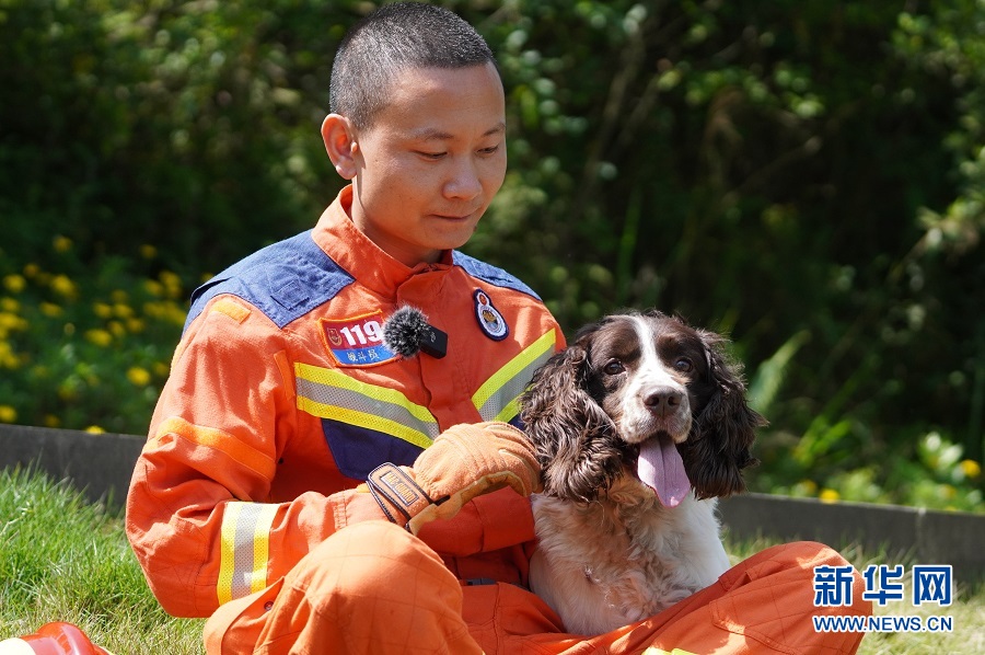 他叫谢耀新,今年30岁,是一名搜救犬训导员。搜救犬“花花”是他的搭档。