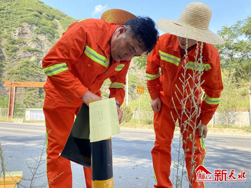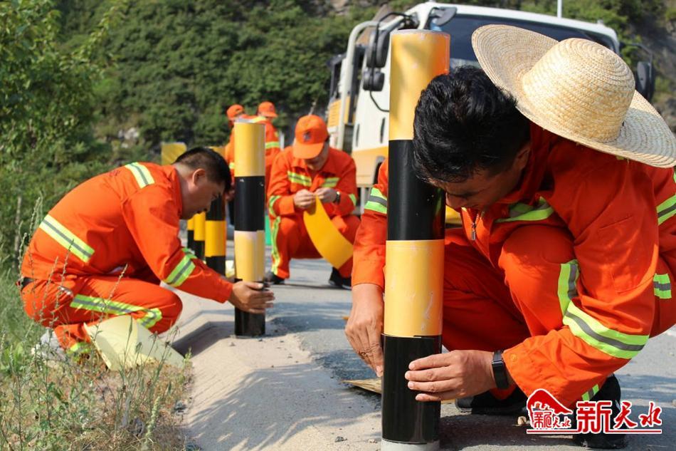 一群橘红色的身影在G566线上有的提着水桶拿着抹布擦洗示警柱、有的裁剪张贴反光膜,大家顶烈日、冒酷暑,按照规范要求,紧张有序地忙碌着,完全不顾汗水已湿透了衣服,沿线呈现出一幅幅大干场景。 “粘贴反光膜前要必须清理干净示警柱表面的油污、灰尘,然后选择裁剪好的反光膜先撕开一点底膜,将其贴在警示柱上,边粘贴边撕底膜,贴的动作要慢,这样利于粘贴时反光膜和被贴面排出多余的空气,让反光膜和被贴面粘贴得更紧密、平整、牢固”,张贴反光膜看似简单,但要贴得美观还要讲究技巧,党支部书记姬遂胜在作业现场为大家一边示范一边讲解贴膜的技巧。经过连续两天的努力, G566线沿线378个损坏、脱落的反光膜全部更换,示警柱重新焕发出亮丽的色彩,提高了夜间行车安全度,安全示警效果更加明显。