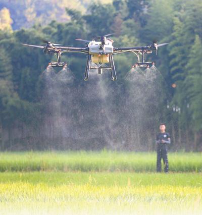 8月4日,浙江杭州临安区天目山镇“天目粮仓”粮食基地,农技人员遥控植保无人机对水稻进行喷药除虫作业。