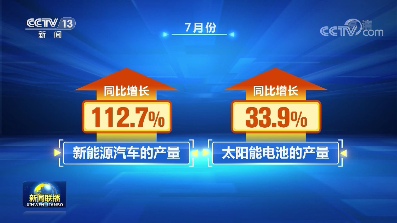 7月份,新能源汽车、太阳能电池的产量同比分别增长112.7%和33.9%,我国绿色转型的步伐在加快。