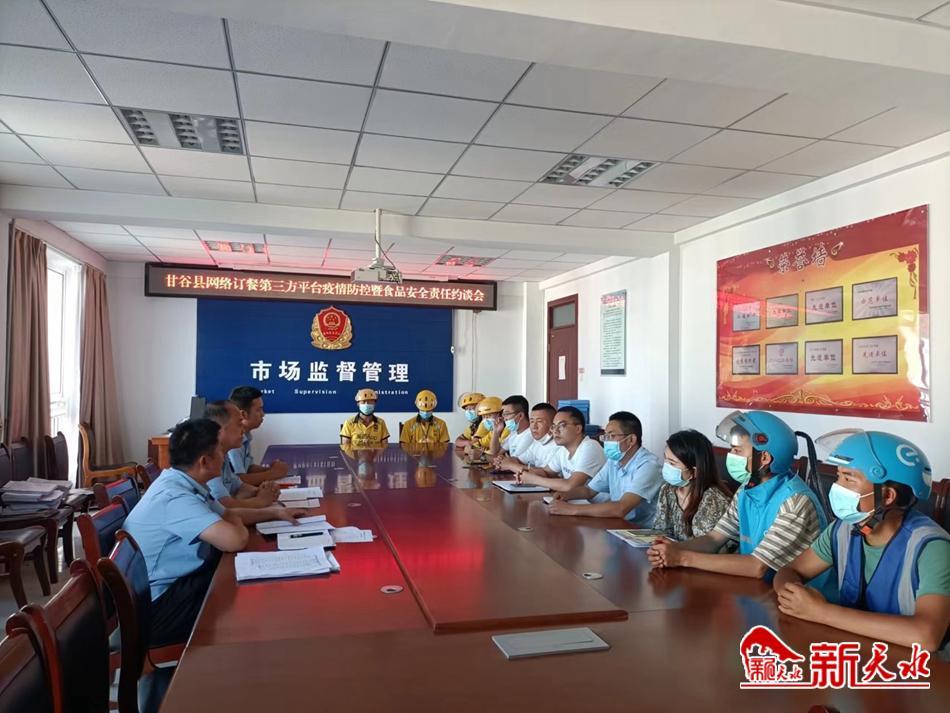 新天水讯【特约通讯员 黄少华 李凯】近日,甘谷县市场监督管理局召开了“饿了么”“美团外卖”两家网络订餐第三方平台现场责任约谈会议,加大网络订餐监管力度,规范网络订餐经营行为。