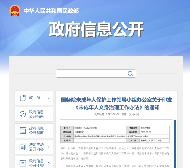 为加强未成年人文身治理,保护未成年人身心健康,国务院未成年人保护工作领导小组办公室经商中央宣传部、中央网信办、最高人民法院、最高人民检察院、教育部、公安部、民政部、司法部、商务部、卫生健康委、市场监管总局、广电总局、共青团中央、全国妇联达成一致,今天发布了《未成年人文身治理工作办法》(以下简称《办法》),对加强未成年人文身治理提出系列工作举措。