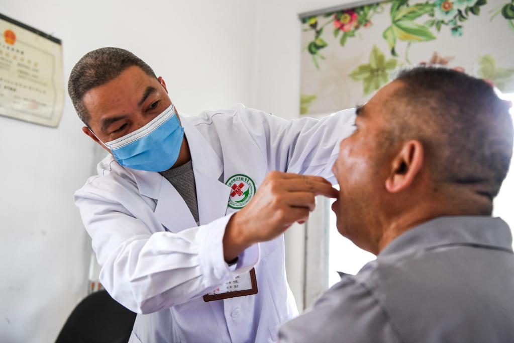 2021年11月3日,在广西崇左大新县下雷镇仁爱村,乡村医生赵建柏为村民检查口腔。新华社记者 曹祎铭 摄