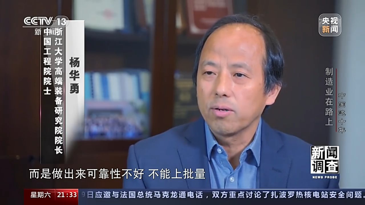 中国工程院院士 浙江大学高端装备研究院院长 杨华勇:大吨位的起重机、挖掘机大量进口,咱们就没有自己的,中国不是说做不出来,而是做出来可靠性不好,不能上批量。
