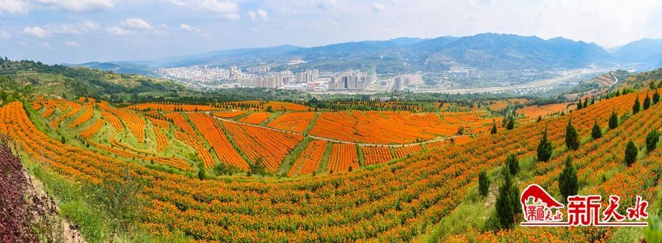 八月的清水,漫山遍野万寿菊竞相开放,金灿灿的花海成为一道美景,更为群众增收致富带来了广阔“钱”景。清水县把万寿菊全产业链作为今后重点培育发展的农业特色主导产业之一,今年共在18个乡镇236个村种植6.8万亩,预计村均将实现增收11.86万元。在红堡生态工业园,日加工500吨的万寿菊鲜花生产线和日加工6吨的万寿菊油膏萃生产线建设正酣,生产线建成后,即可对全县万寿菊产品进行精深加工,增加产品附加值,着力打造清水万寿菊系列产品品牌,真正让清水的万寿菊产业立得住、叫得响、效益好。