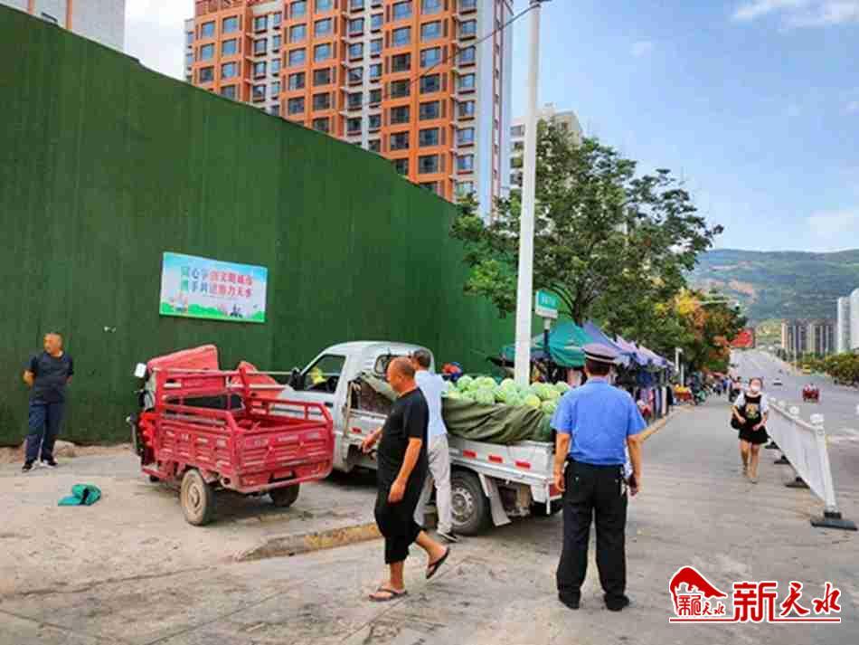 新天水【通讯员曹志岐 陈健】近期以来,麦积区花牛镇周边农村的农户种植的玉米、葡萄、桃子等瓜果蔬菜随着大量上市,农户到花牛辖区后,大多数沿街摆摊,堵塞道路、噪音扰民、果皮菜叶随意丢弃的问题比较突出。