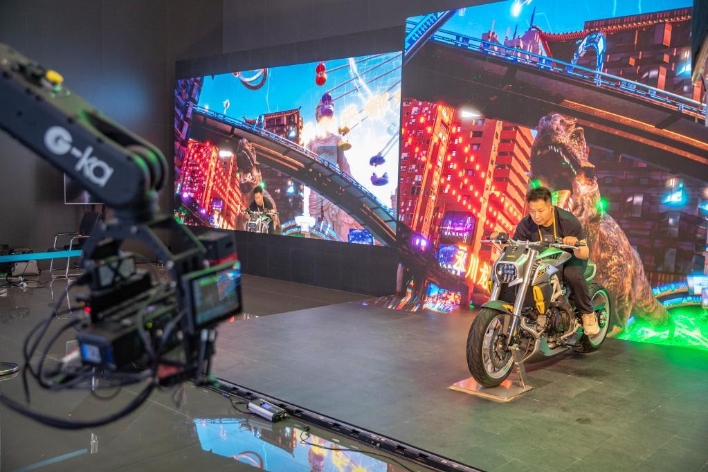 8月21日,在2022智博会重庆展馆内,工作人员在演示XR扩展现实拍摄技术。新华社记者黄伟 摄
