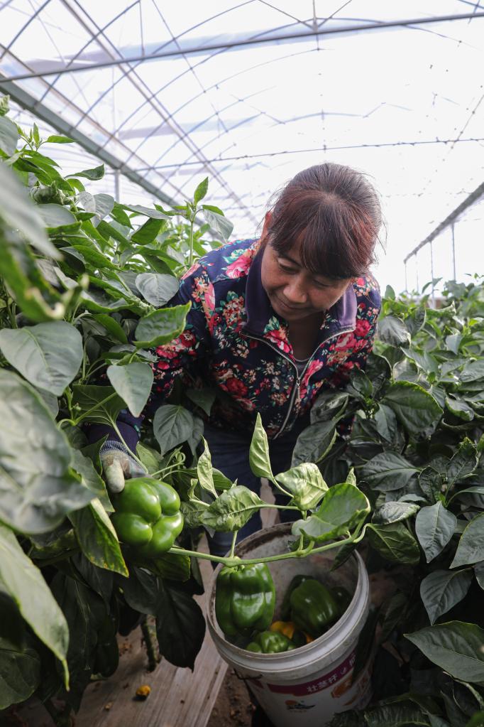 榆中县康源现代设施农业示范园区,村民在采摘辣椒。新华社记者杜哲宇 摄