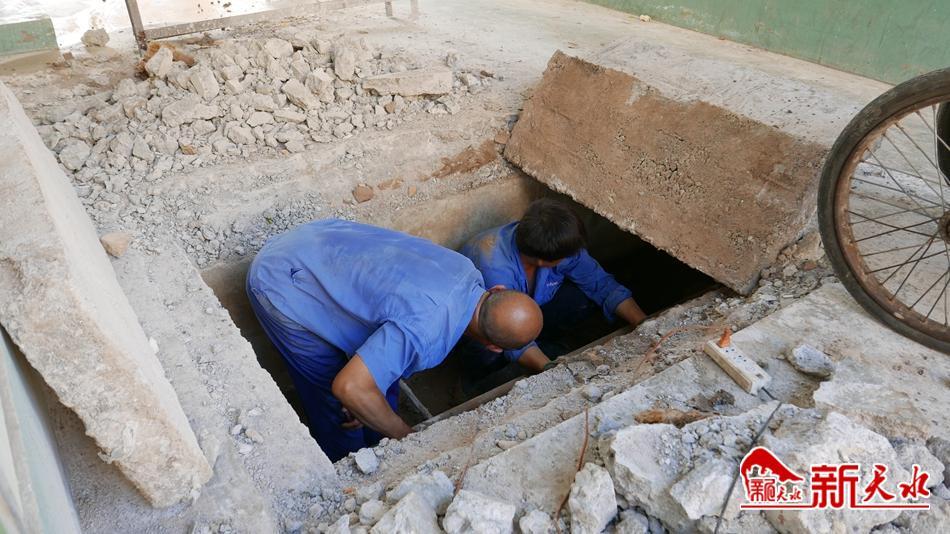 在通往星火幼儿园的楼道口,物业管理公司靳全生、赵勇、高海伟、宋第安等几位师傅,撬开密封暖气管道的石板,接上照明灯,钻进高度和宽度都不到1米的管道井,更换年久失修的暖气管道,为冬季取暖做准备。