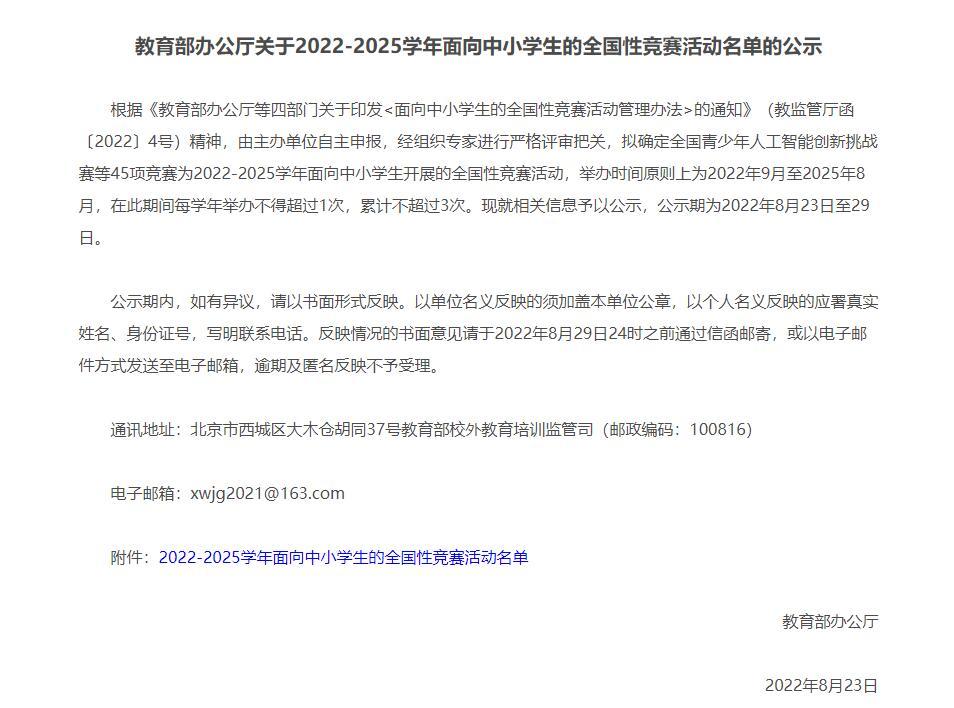 新华网北京8月23日电 今日,教育部办公厅公示了2022-2025学年面向中小学生的全国性竞赛活动名单。据悉,相关名单由主办单位自主申报,经组织专家进行严格评审把关。目前,拟确定全国青少年人工智能创新挑战赛等45项竞赛为2022-2025学年面向中小学生开展的全国性竞赛活动,举办时间原则上为2022年9月至2025年8月,在此期间每学年举办不得超过1次,累计不超过3次。
