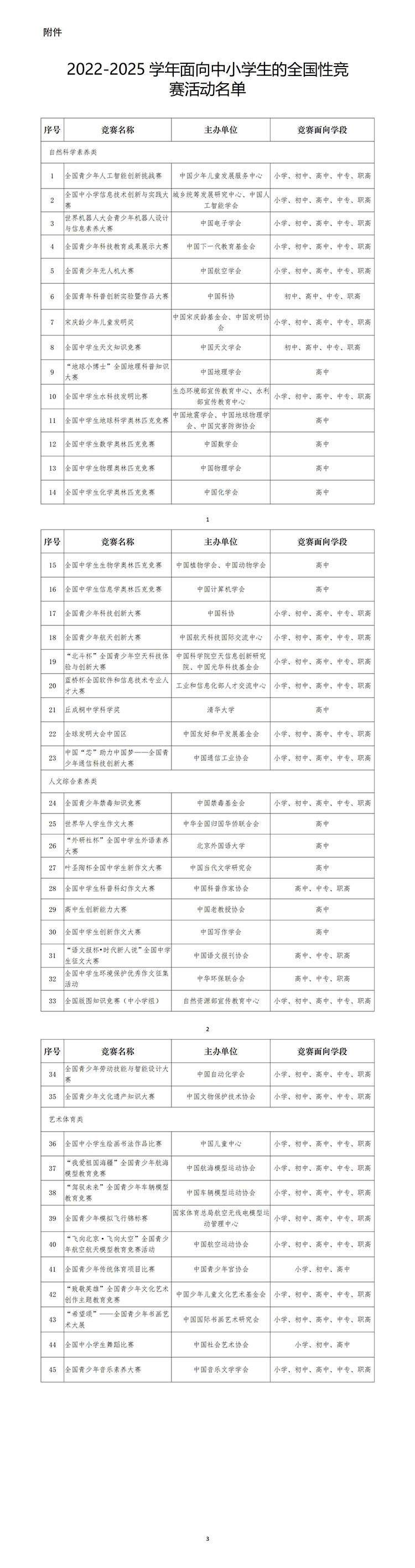 2022-2025学年面向中小学生的全国性竞赛活动名单公布