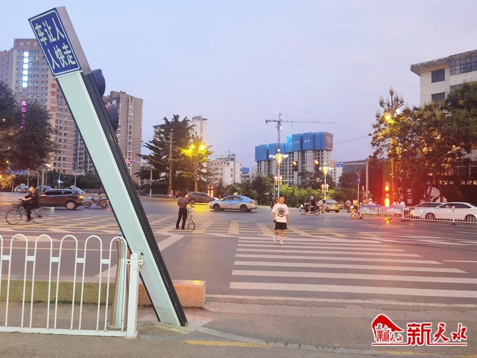 8月22日晚,在秦州区东桥头建设路与新华路交叉路口,一交通设施红绿灯倾斜,存在安全隐患。冰帆 摄