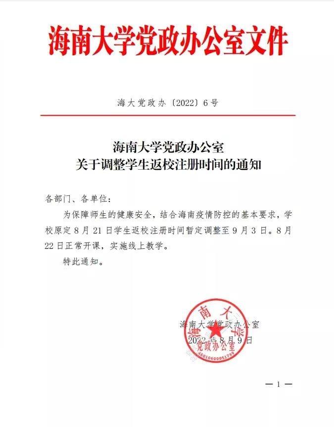 海南大学:原定8月21日学生返校注册时间暂定调整至9月3日。