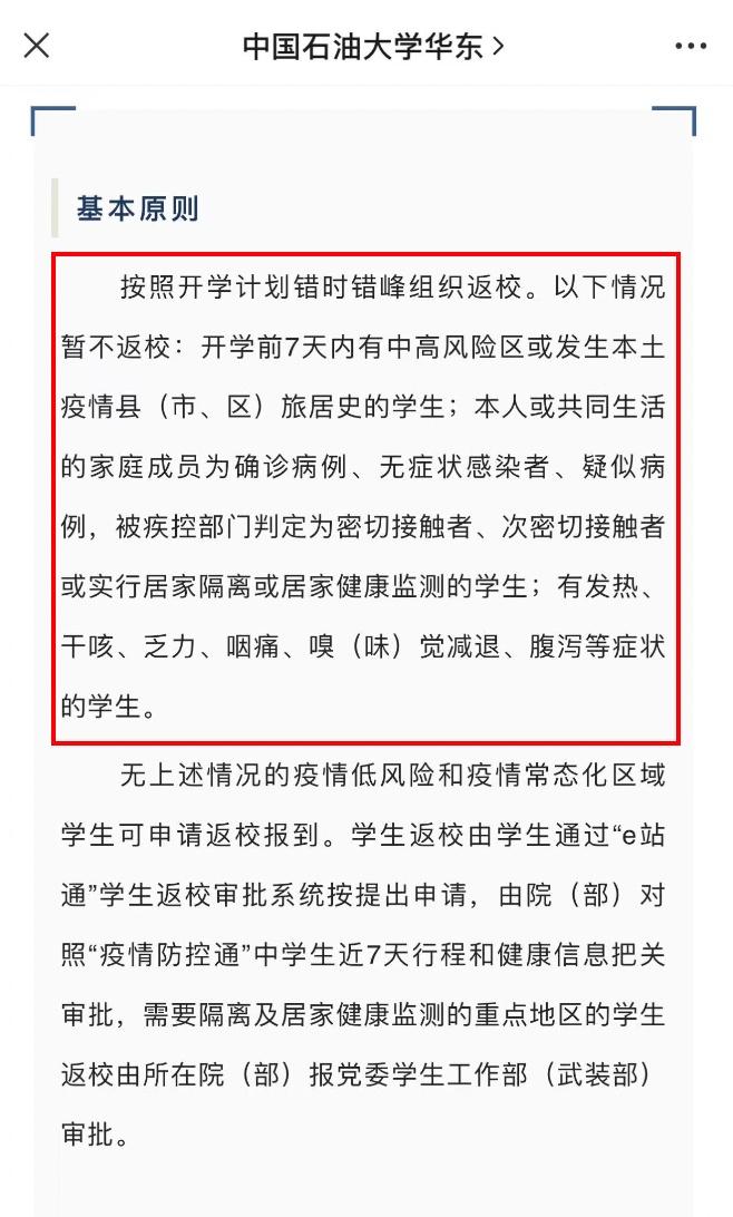 8月19日,记者梳理中国石油大学(华东)、青岛科技大学、青岛农业大学等驻青高校返校安排获悉,高校学子秋季学期继续实行分批错峰返校,未经学校审批同意一律不得提前返校。