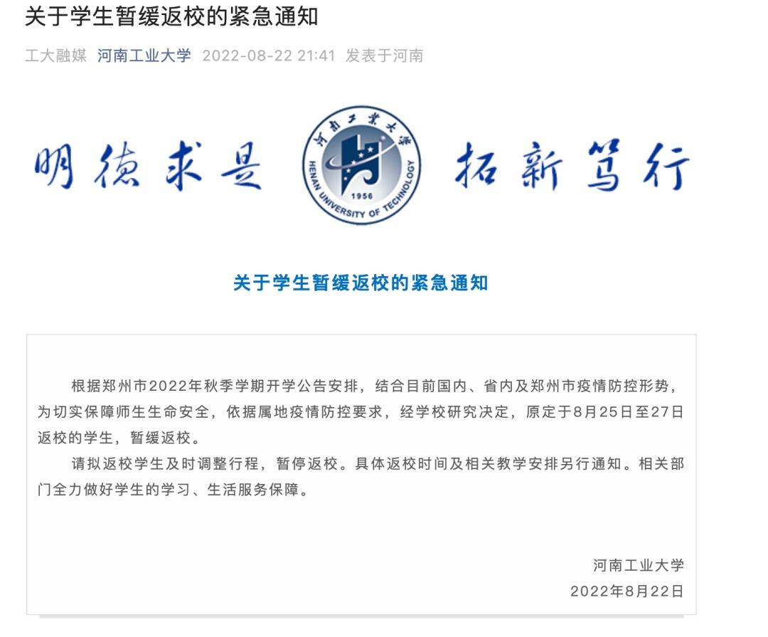 河南工业大学:原定于8月25日至27日返校的学生,暂缓返校。