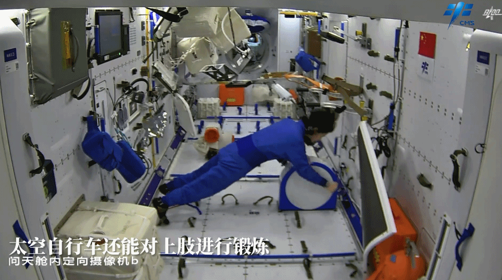 问天舱扩展了航天员们的生活、工作空间,航天员们将太空自行车搬到了问天舱内,业余时间进行锻炼。