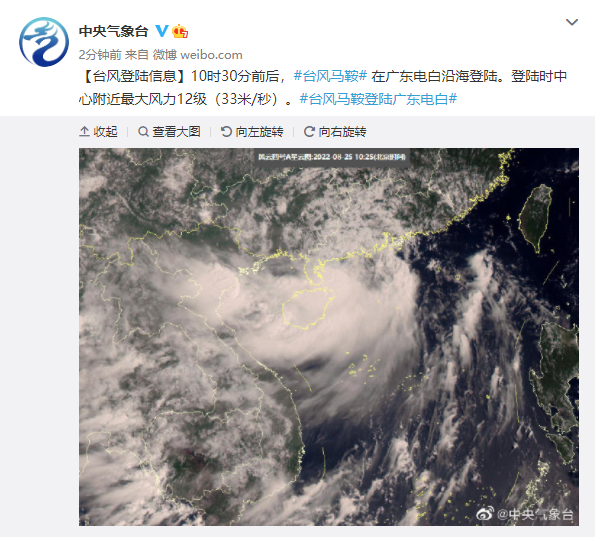 10时30分前后,台风“马鞍”在广东电白沿海登陆。登陆时中心附近最大风力12级(33米/秒)。