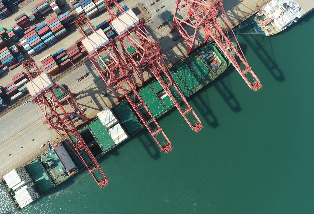 资料图片:5月3日,江苏省连云港港集装箱码头到港货船在装运集装箱(无人机照片)。 新华社发(王健民摄)
