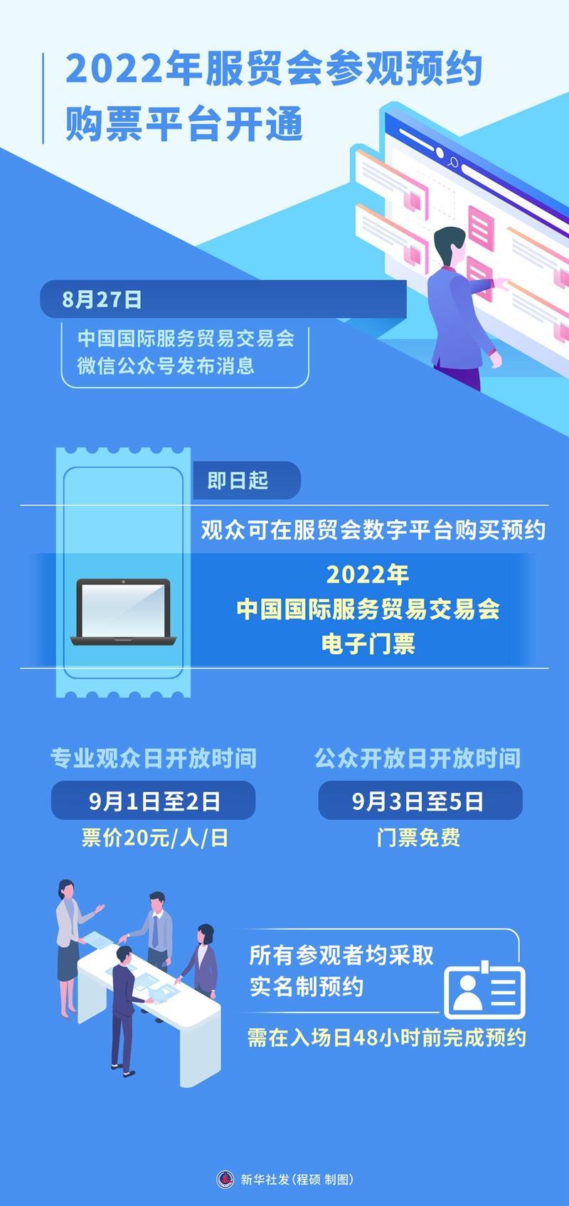 新华社北京8月27日电(记者吉宁)27日,中国国际服务贸易交易会微信公众号发布消息,即日起,观众可在服贸会数字平台购买预约2022年中国国际服务贸易交易会电子门票。专业观众日开放时间为9月1日至2日,票价20元/人/日;公众开放日开放时间为9月3日至5日,门票免费。所有参观者均采取实名制预约,需在入场日48小时前完成预约。