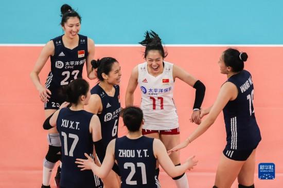 8月27日,中国队球员在比赛中庆祝得分。当日,在菲律宾帕西格市举行的2022年女排亚洲杯四分之一决赛中,中国队以3比0战胜澳大利亚队,晋级半决赛。新华社发(乌马利摄)