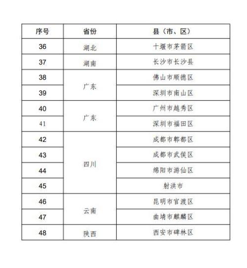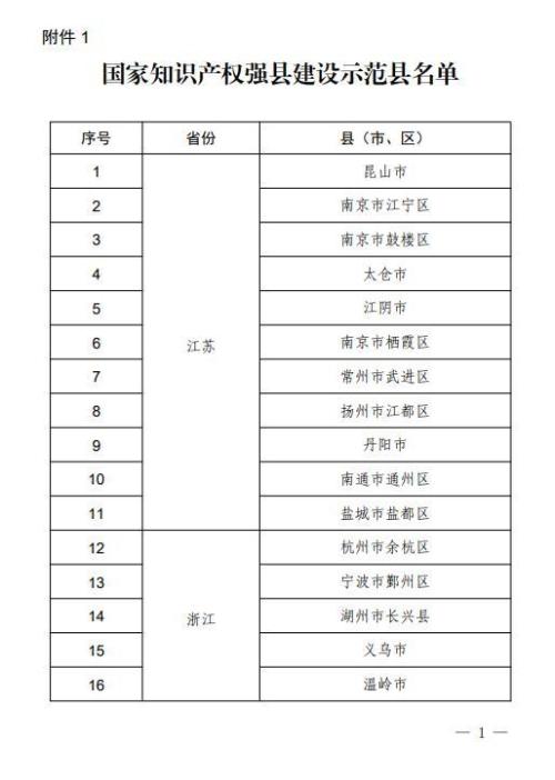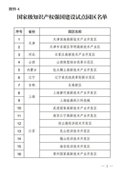 按照《国家知识产权局办公室关于面向城市、县域、园区开展知识产权强国建设试点示范工作的通知》(国知办函运字〔2021〕1197号)要求,经地方申报推荐、材料审查、专家评审等程序,确定江苏省昆山市等48个县(市、区)为国家知识产权强县建设示范县(名单见附件1),河北省遵化市等151个县(市、区)为国家知识产权强县建设试点县(名单见附件2),北京经济技术开发区等22个园区为国家级知识产权强国建设示范园区(名单见附件3),天津滨海高新技术产业开发区等64个园区为国家级知识产权强国建设试点园区(名单见附件4),试点示范时限自2022年8月至2025年7月。