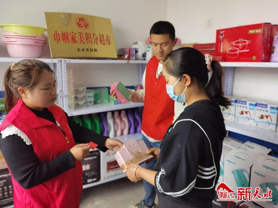 走进米谷村积分超市,看到一排排货架上整齐地摆放着牙膏、纸巾、洗洁精、杯子等各类生活用品,每件物品都“明码标价”,墙上张贴着兑换标准。6位村民们正高兴地排着队,用手中的积分卡兑换需要的生活用品,大家有说有笑,脸上洋溢着喜悦的笑容。