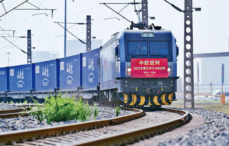 2022年8月21日,中欧班列(西安—汉堡)从西安国际港站开出。至此,中欧班列2022年累计开行10000列,较2021年提前10天破万列;累计发送货物97.2万标箱,同比增长5%。 新华社发 唐振江/摄