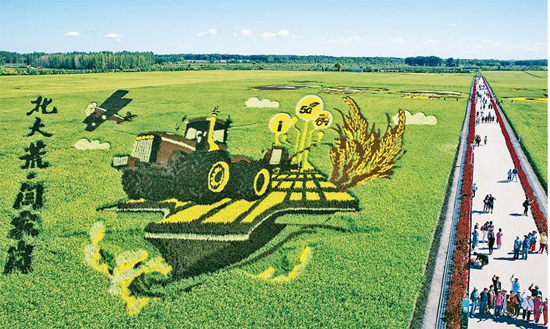 日前,北大荒集团闫家岗农场有限公司农业现代化示范区的稻田画正式对外开放。该片稻田应用了5G核心网加上物联网、大数据、人工智能等技术,实现农业生产“感联智控”。图为2022年8月20日,游客在示范区观光并了解农业科技。 新华社记者 张涛/摄
