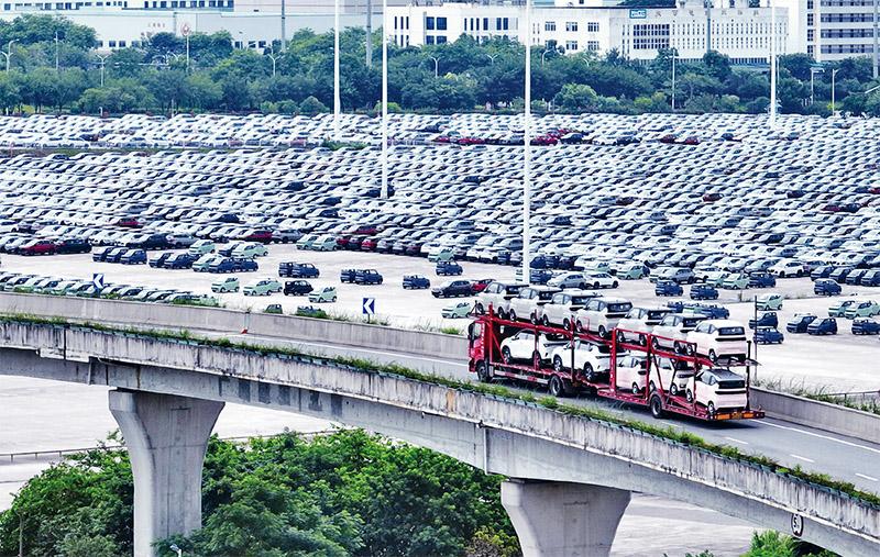 近年来我国新能源汽车产业发展迅速,产销量和保有量位居世界前列。2022年1—7月,新能源汽车产销分别完成327.9万辆和319.4万辆,同比均增长1.2倍。图为7月6日,满载新能源汽车的货车从广西柳州汽车城一物流基地旁经过(无人机照片)。 新华社发 黎寒池/摄