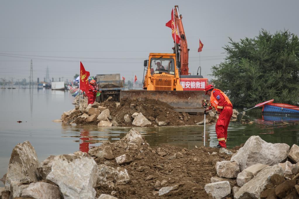 8月6日,抢险人员在辽宁绕阳河溃口处进行封堵作业。新华社记者潘昱龙 摄