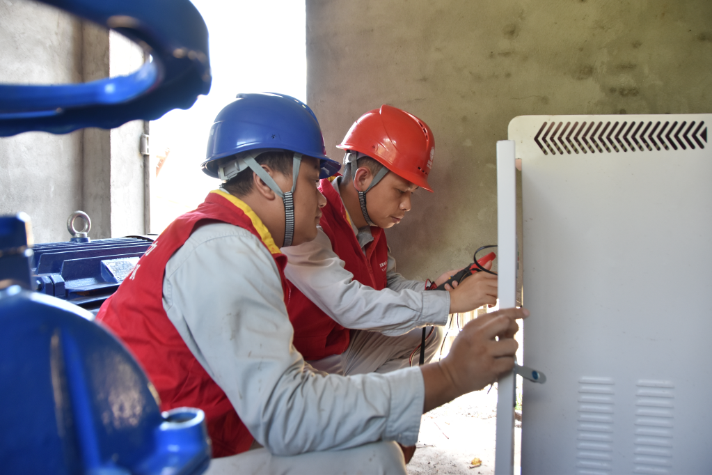 8月25日,湖南省常宁市电力工人在检查泵房设备。新华社记者白田田 摄