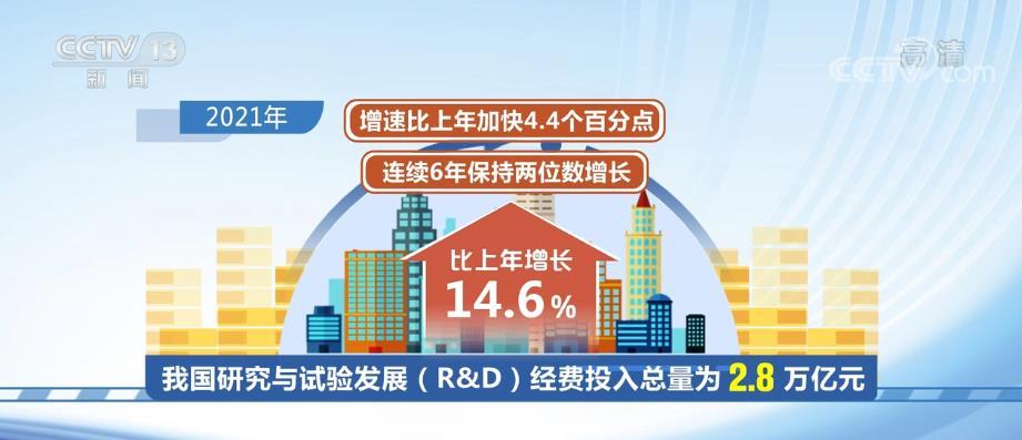 2021年我国研究与试验发展(R&D)经费投入总量为2.8万亿元,比上年增长14.6%,增速比上年加快4.4个百分点,连续6年保持两位数增长。