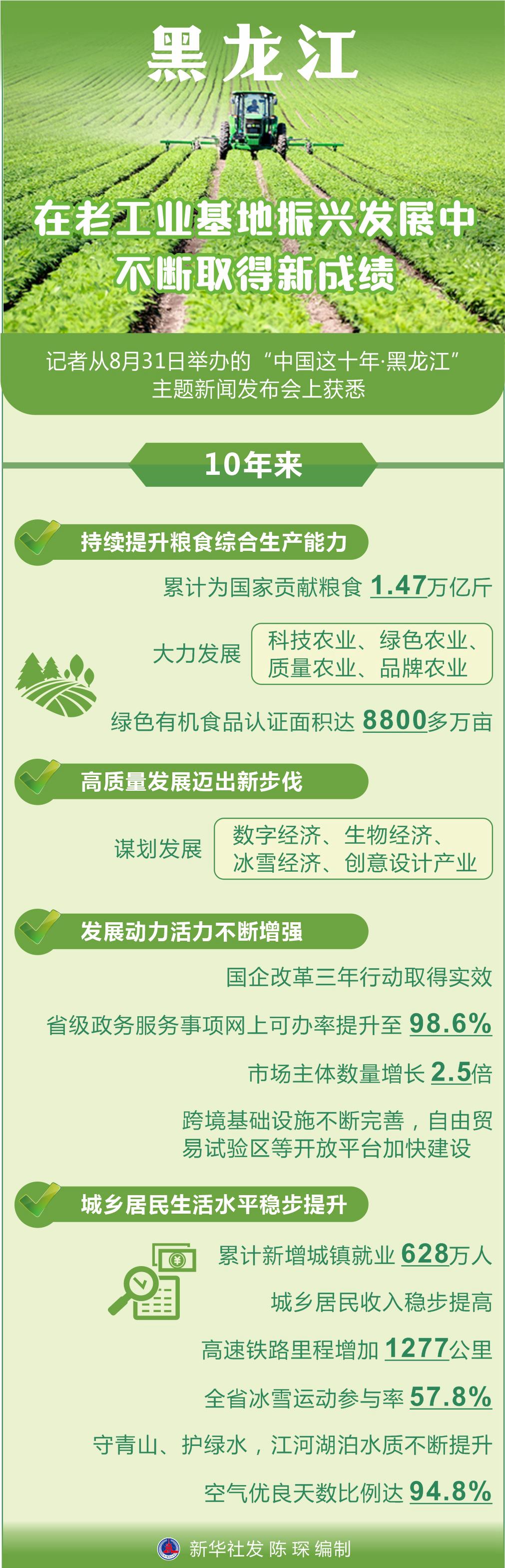 新华社哈尔滨8月31日电(记者王春雨、杨思琪)记者从31日举办的“中国这十年·黑龙江”主题新闻发布会上获悉,党的十八大以来,黑龙江深入贯彻落实习近平总书记重要指示精神,深化改革开放,优化发展环境,奋力闯出老工业基地振兴发展新路。