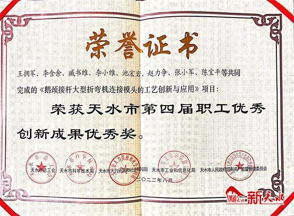 新天水讯 8月30日,天水锻压集团第二联合分厂天水市劳模陈宝平领衔的团队陈宝平劳模创新工作室被命名为天水市第四批示范性劳模(工匠)创新工作室,实业协作贸易创新组被命名为天水市第三批创新型班组。王拥军、李含余等人完成的“鹅颈接杆大型折弯机连接模头的工艺创新与应用”项目荣获天水市第四届职工优秀创新成果优秀奖。