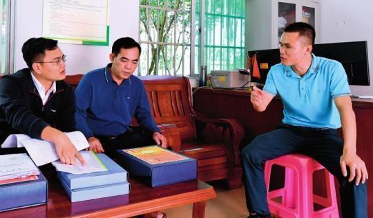 在海南省琼中黎族苗族自治县湾岭镇加章村委会,纪检监察干部(左一)在查阅乡村振兴及村级财务支出相关材料(2021 年 11 月13 日摄) 杨冠宇摄 / 本刊