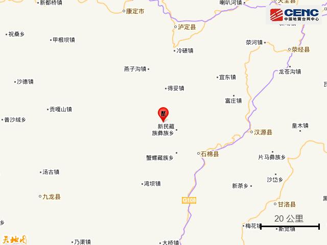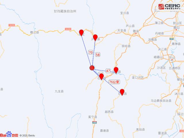 震中距石棉县26公里、距汉源县47公里、距泸定县58公里、距康定市70公里、距甘洛县76公里,距甘孜藏族自治州75公里,距雅安市108公里,距成都市231公里。