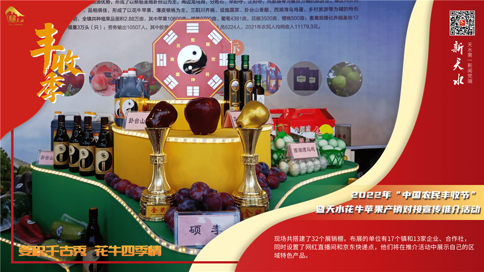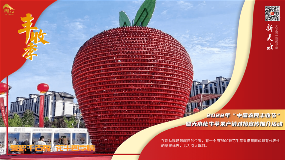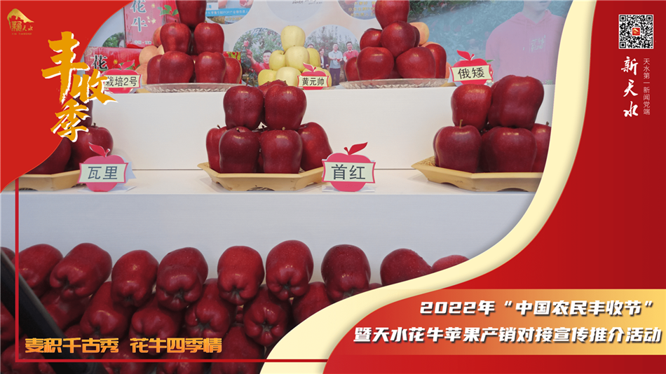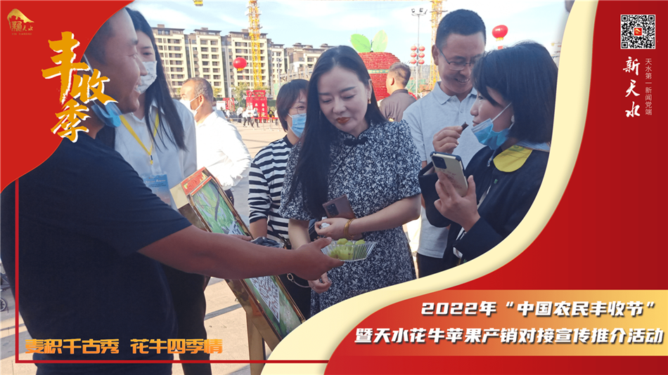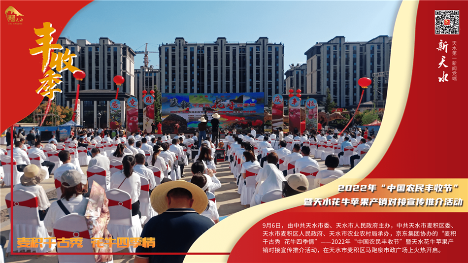 9月6日,由中共天水市委、天水市人民政府主办,中共天水市麦积区委、天水市麦积区人民政府、天水市农业农村局承办,京东集团协办的“麦积千古秀 花牛四季情”——2022年“中国农民丰收节”暨天水花牛苹果产销对接宣传推介活动,在天水市麦积区马跑泉市政广场上火热开启。