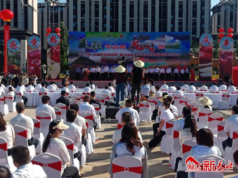 新天水讯【记者王晓馨 李旺旺】金秋送爽,硕果迎宾。9月6日,由中共天水市委、天水市人民政府主办,中共天水市麦积区委、天水市麦积区人民政府、天水市农业农村局承办,京东集团协办的“麦积千古秀 花牛四季情”——2022年“中国农民丰收节”暨天水花牛苹果产销对接宣传推介活动,在天水市麦积区马跑泉市政广场上火热开启。