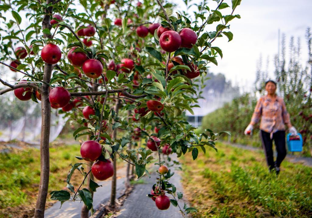 8月28日,农户在云南省大理市喜洲镇大本农业苹果产业研发基地采摘苹果。新华社记者 江文耀 摄