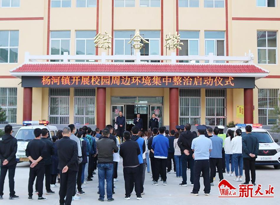 新天水讯 近日,武山县杨河镇组织镇综合行政执法队、派出所、司法所、市场监管所、杨河学区、杨河初中等单位走进校园、超市、出租房、五小场所等,排查校内外安全隐患,切实维护校园周边安全秩序,织密校园“防护网”,护航平安“开学季”。