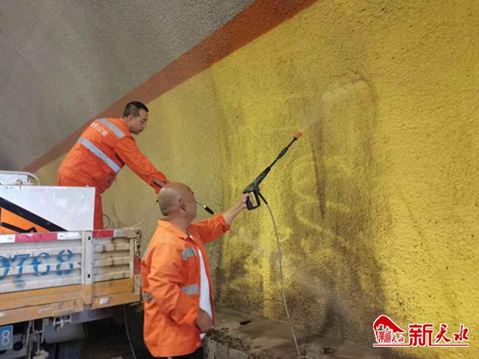 隧道“美容保洁”。养护人员利用三台高压水枪冲洗隧道墙面、检修道、标线和洞口立面标记,冲洗了被污染的交通设施表面污垢,对难以冲洗的污垢,养护人员拿着毛刷和拖把再次擦洗,确保所有脏污清洗干净,隧道面貌焕然一新。